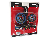 Манометрический коллектор для хладагента R-12. К штуцерам подключаются шланги для заправки хладагента или проверки давления, а вентили обеспечивают герметичность контуров и простую регулировку подачи хладагента.