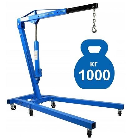 Поднимает 99% двигателей легковых и Джипов в России. 63 кг металла. Кран гидравлический 1т. Складной. Для подъёма и перемещения агрегатов автомобиля по гаражу. Регулируемая стрела с цепью и крюком. Высота подъёма крана от пола цеха – 0÷2120 мм.