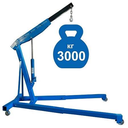 Для профессионального применения. Грузоподъемность 3т. Не складной. Высота подъема 330-2450 мм. Предназначен для подъема и транспортировки автомобильных узлов, агрегатов и любых других грузов как внутри помещения так и на улице. Вынос стрелы регулируется в соответствии с максимальной грузоподъемностью крана – 1000-3000кг. Рабочим приводом крана является гидроцилиндр.