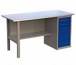 Однотумбовый. Допустимая нагрузка на столешницу 750 кг. Опорные элементы выполнены сварными из холоднокатаной стали. Для выполнения сборочных, ремонтных, слесарных, монтажных и других видов работ на производстве, в сервисных центрах, мастерских, гаражах, а также для обучения технологии в учебных заведениях. Комплектуется полкой-стенкой, расположенной под столешницей для удобного размещения габаритного инструмента и оснастки. Размеры верстака: 855x1596x696 мм. Вес: 65 кг. Поставляется в 4 комплектациях на выбор.