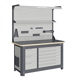 Нагрузка на столешницу 1500 кг. Столешница из листа влагостойкой фанеры марки ФСФ толщиной 40 мм и листом горячекатаной стали толщиной 5 мм. Рама верстака выполнена их холоднокатаной стали. Модуль верстака выполнен сварными. Ящики в модулях устанавливаются на шариковых телескопических направляющих полного выдвижения. Квадратная перфорация для установки крючков, держателей. Размеры: 1982x1493x743 мм.