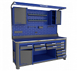 Нагрузка на столешницу 1500 кг. Столешница из листа влагостойкой фанеры марки ФСФ толщиной 40 мм и листом горячекатаной стали толщиной 5 мм. Рама верстака выполнена их холоднокатаной стали. Модуль верстака выполнен сварными. Ящики в модулях устанавливаются на шариковых телескопических направляющих полного выдвижения. Квадратная перфорация для установки крючков, держателей. Размеры: 1982x1493x743 мм