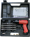 Компактный и мощный инструмент. Корпус выполнен из легкого и прочного алюминиевого сплава. Для выполнения ударных, режущих и рубящих работ или удаления заклепок, снятия слоя старого покрытия. При длине 130 мм частота ударов молотка составляет 4300 уд/мин. Рабочий ход составляет 43 мм. В комплект поставки входят 2 стальных зубила.