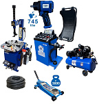 Комплект: шиномонтажный станок TS-21 для дисков: внешний 11÷20” + пистолет с манометром для подкачки шин + монтажка + пластиковые накладки на зажимные кулачки + регулятор давления с влагоотделителем и манометром. + TS-500 балансировочный станок с автозапуском, для колес легковых автомобилей и легких грузовиков, диаметр диска с резиной до 760 мм. размеры диска: ширина 3"–9” (76-228 мм), диаметр диска 10"–21” (254-533 мм). + кожух защитный + клещи + кронциркуль + быстрозажимная гайка + набор конусов + подкатной домкрат г/п 3,0т. 130-465мм. + ударный пневмогайковерт 1/2" крутящий момент 745Нм + шланг кислородный 9мм 20Атм. 10м