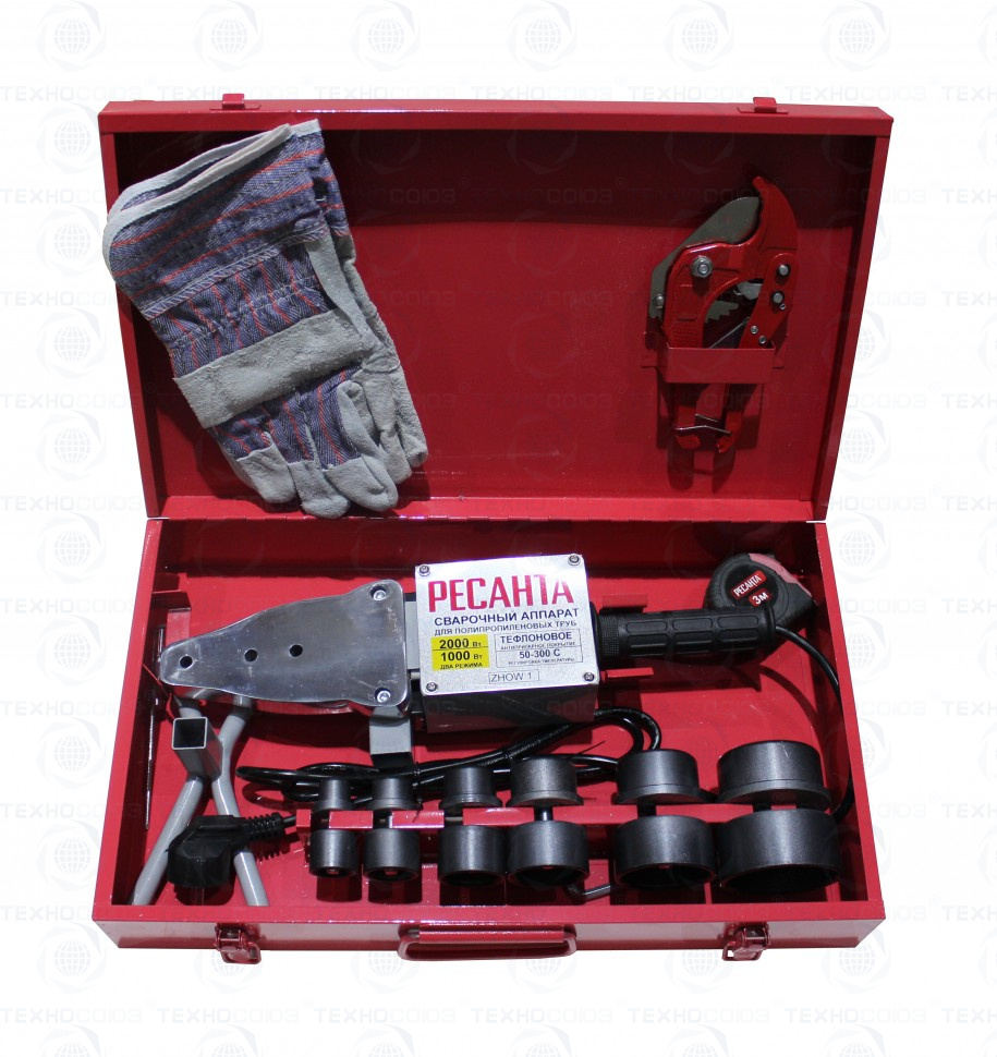 Комплектация Сварочный аппарат 1 шт., Насадки (диаметр 20,25,32,40,50,63) 6 пар, Подставка под сварочный аппарат 1 шт., Руководство по эксплуатации 1 шт., Отвёртка 1 шт., Ключ имбусовый 1 шт., Кейс 1 шт., Рулетка 1 шт., Ножницы для резки труб 1 шт., Спилковые перчатки
