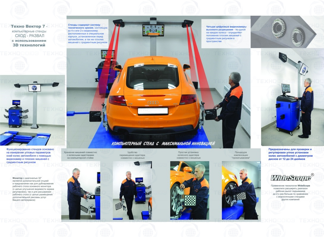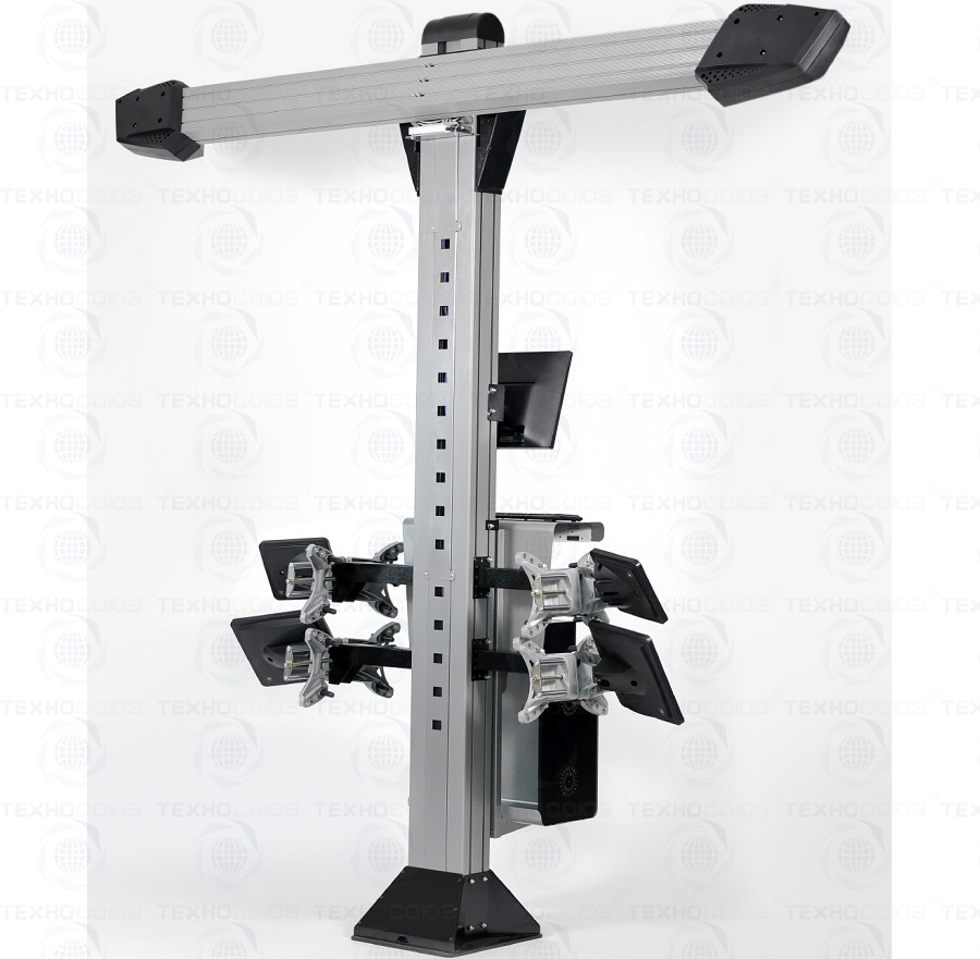 Техно Вектор 7 Aluminum - четырехкамерный стенд сочетающий в себе лаконичный дизайн с высокими потребительскими качествами. Стенд оснащен неподвижными 2 видеокамерами по 1,3 Мп. и 2 камерами по 5 Мп. и компьютерной стойкой, которая крепится на столб. Расстояние от камер до центра передних поворотных платформ 2200 - 3000 мм (измерительная высота на уровне пола). Можно устанавливать на подъемнике.