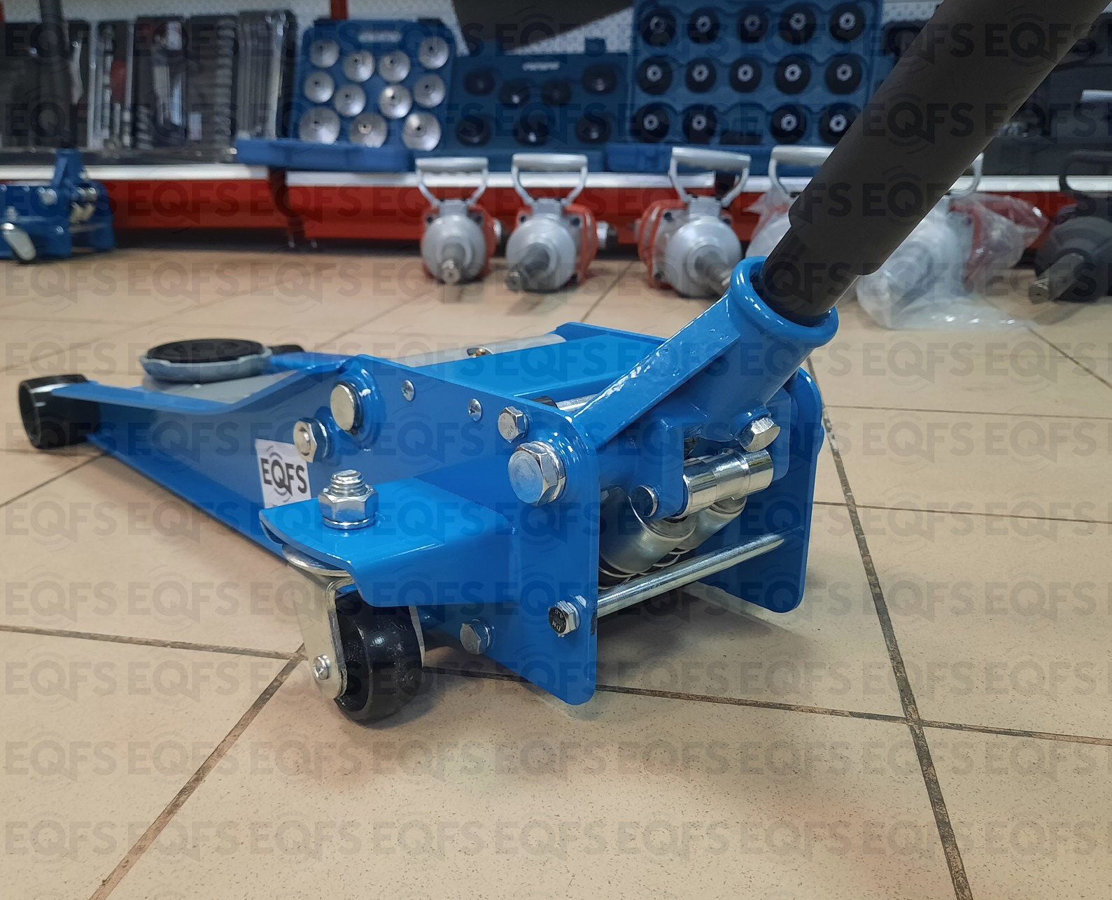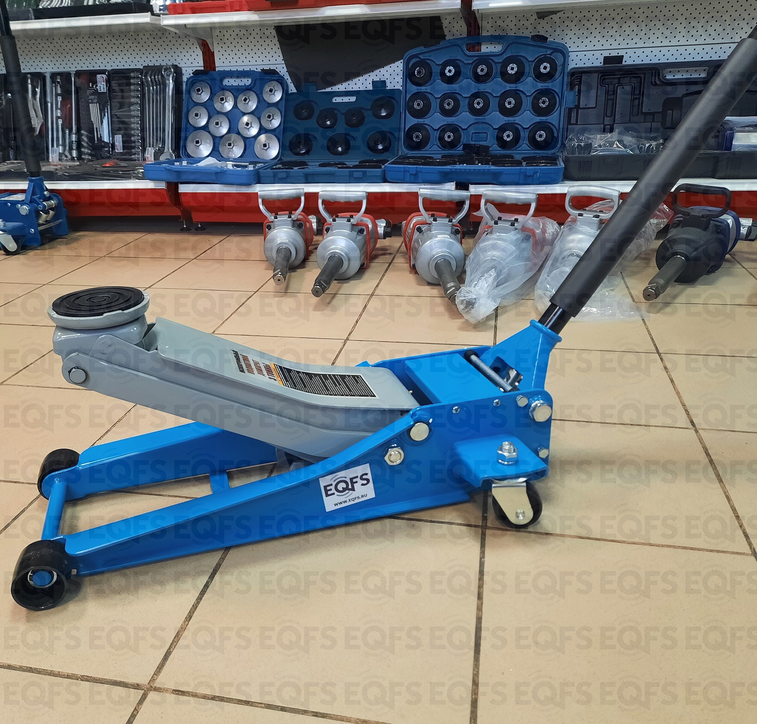 Для профессионалов. Низкопрофильный. Подкатной. Двухштоковый механизм с усиленной конструкцией. Быстрый подъем. С тавотницей. Для применения в шиномонтажных мастерских и автосервисах для поднятия автомобилей с низким клиренсом.  г/п 3 тонны. Высота подъема мин / макс - 75-505 мм. Масса 34 кг.