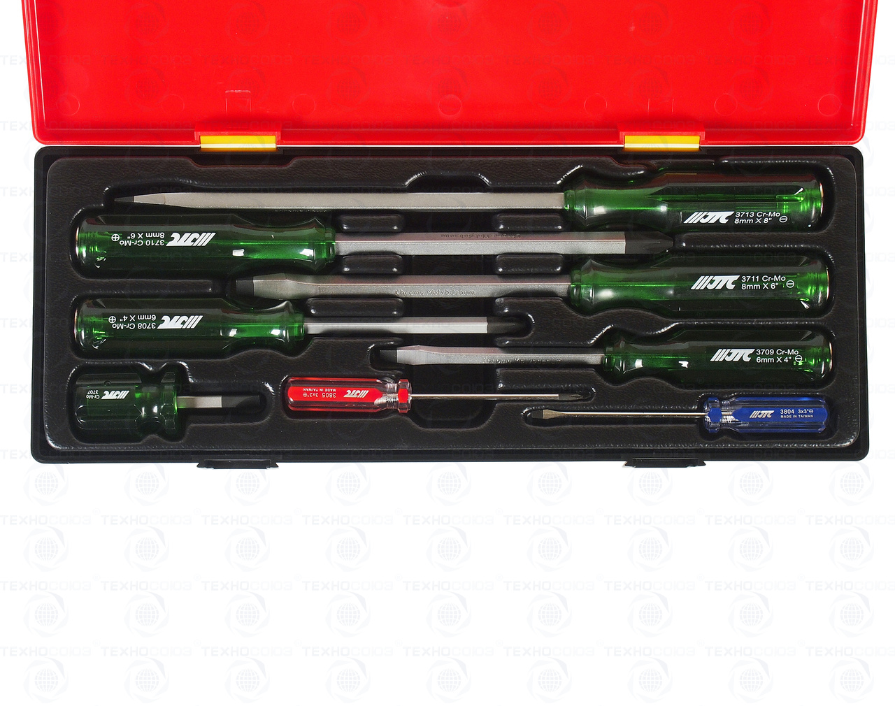 • JTC-3708-3713: отвертки со сквозным стержнем: минус 6x100 мм., 8x150 мм, 8x200 мм., плюс #2x100 мм., #3x150 мм. - всего 5 шт.