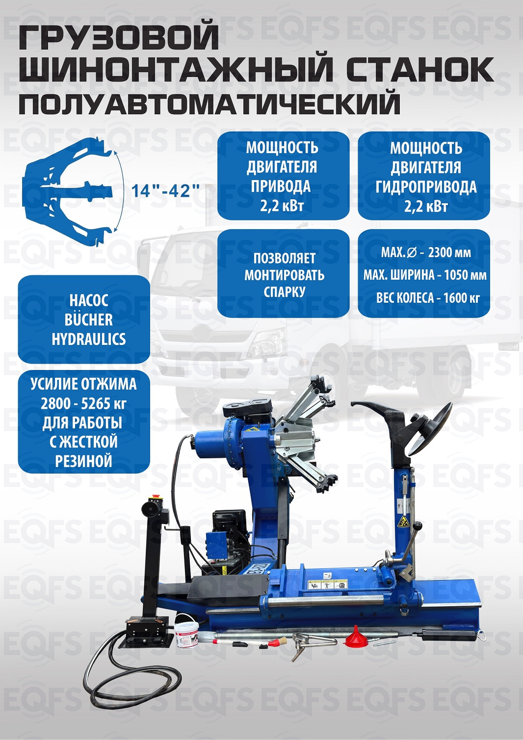 Комплект ES-52D грузовой шиномонтажный станок класса «премиум» для «жестких» условий эксплуатации. Диски алюминий и сталь диаметром 14”-42”, Максимальное колесо 2300х1050 мм, вес колеса до 1600кг. Моторы 2,2 + 2,2 кВт. Гидравлика – немецкая «BUCHER HIDRAULICS». Идеально подходит для тракторов, сельхозтехники, дорожной техники. Гарантия до 18 месяцев.+ ES-850 Балансировочный станок 380V. Балансирует грузовые и легковые диски - 13-24” ширина 1,5-20”, Колесо «в сборе» - до 1200 мм, вес до 150кг. Напряжение 380В. Встроенный пневмоподъемник. Балансировочный станок для шин легковых, грузовых автомобилей, автобусов, микроавтобусов и т.п.