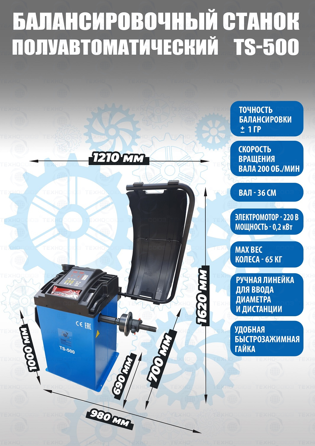 Полуавтоматический балансировочный стенд TS-500 для колес легковых автомобилей, мотоциклов и легких грузовиков с диаметром диска с резиной до 760 мм. Размеры диска: ширина 3–9” (76-228 мм) , диаметр диска" - 10–21” (254-533 мм). Вал-36 мм. Максимальный вес колеса с диском – 65 кг. C кожухом. Точность ±1гр. Напряжение 220В. . В комплекте: кожух с автозапуском + клещи + кронциркуль + быстрозажимная гайка + набор конусов