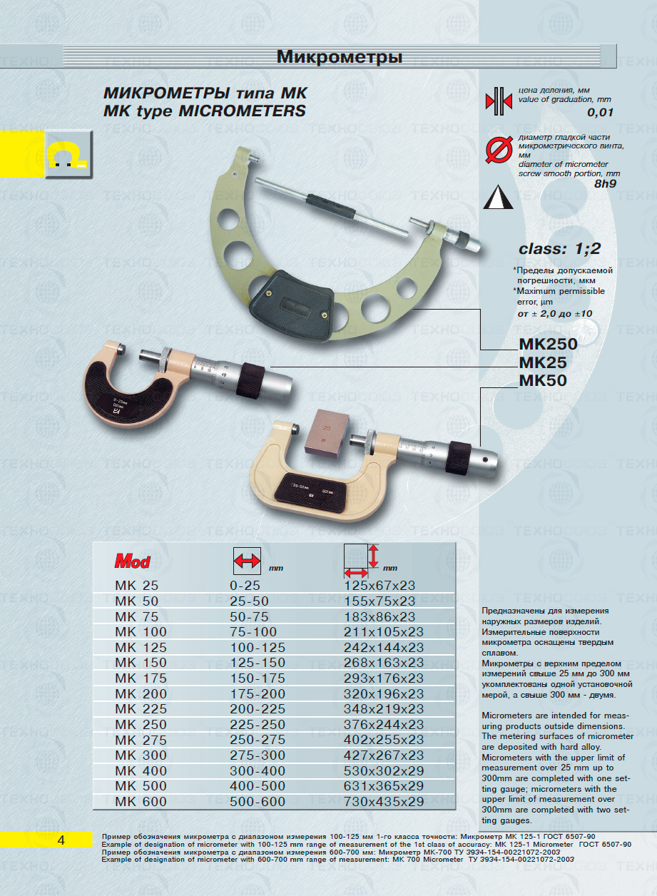 Цена деления 0,01 мм. Диапазон измерения от 200-225 мм. Для измерения наружных размеров изделий. Измерительные поверхности микрометра оснащены твердым сплавом. Микрометры укомплектованы одной установочной мерой. Класса точности 2. ГОСТ 6507-90. Поставляется в двух вариантах с поверкой и без поверки!
