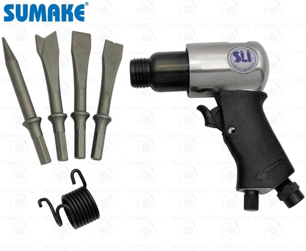Пневмомолоток + 4 зубила предназначены для проведения как отбойных, так и зачистных работ. Частота ударов 4500/мин. Длина хода поршня 41 мм. Хвостовик зубила (шестигранник) 10,1 мм.