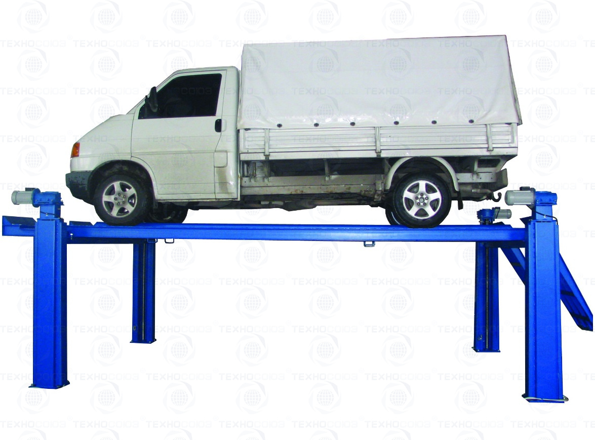 Электромеханический подъемник. Подъемник обеспечивает подъём любых автомобилей снаряженной массой до 5 тонн. Может устанавливаться на бетонируемые в пол рамы или на напольные рамы закрепляемые на полу анкерными болтами. Напольные рамы и анкерные болты поставляются вместе с подъемником по отдельному заказу. Рабочие гайки выполнены из полиамида повышенной прочности и износостойкости. Многоуровневая система безопасности. Привод ходового винта от червячного мотор-редуктора. По отдельному заказу подъёмники могут быть укомплектованы тележкой с домкратом для вывешивания передней или задней оси автомобиля. Подъемник комплектуется микропроцессорной системой синхронизации подъёма-опускания платформ. Подъемник специально разработан для установки стенда регулировки развала-схождения передних колес автомобилей.