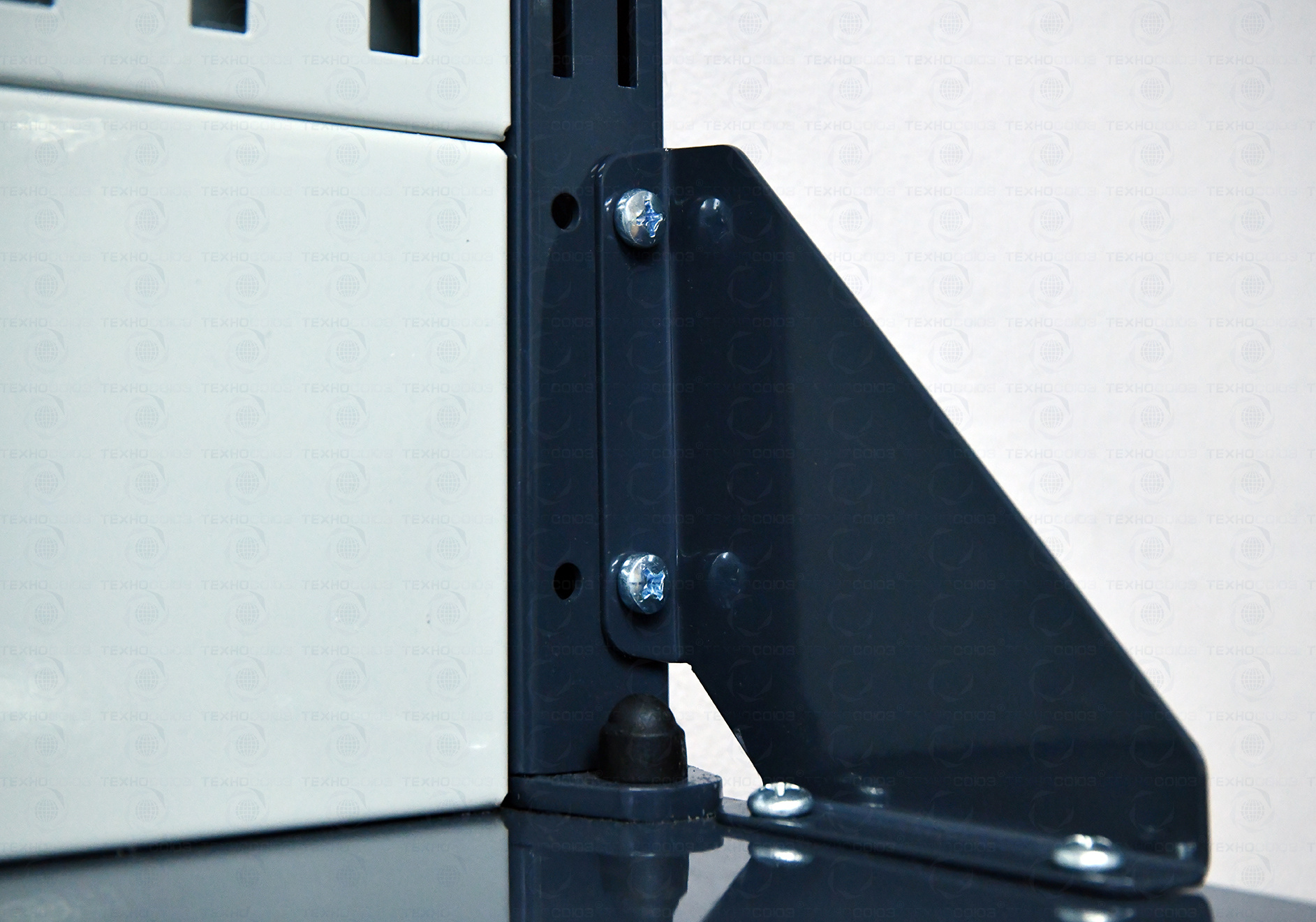 Рама верстака выполнена их холоднокатаной стали. Опоры допускают частичную регулировку по высоте для компенсации неровности пола.