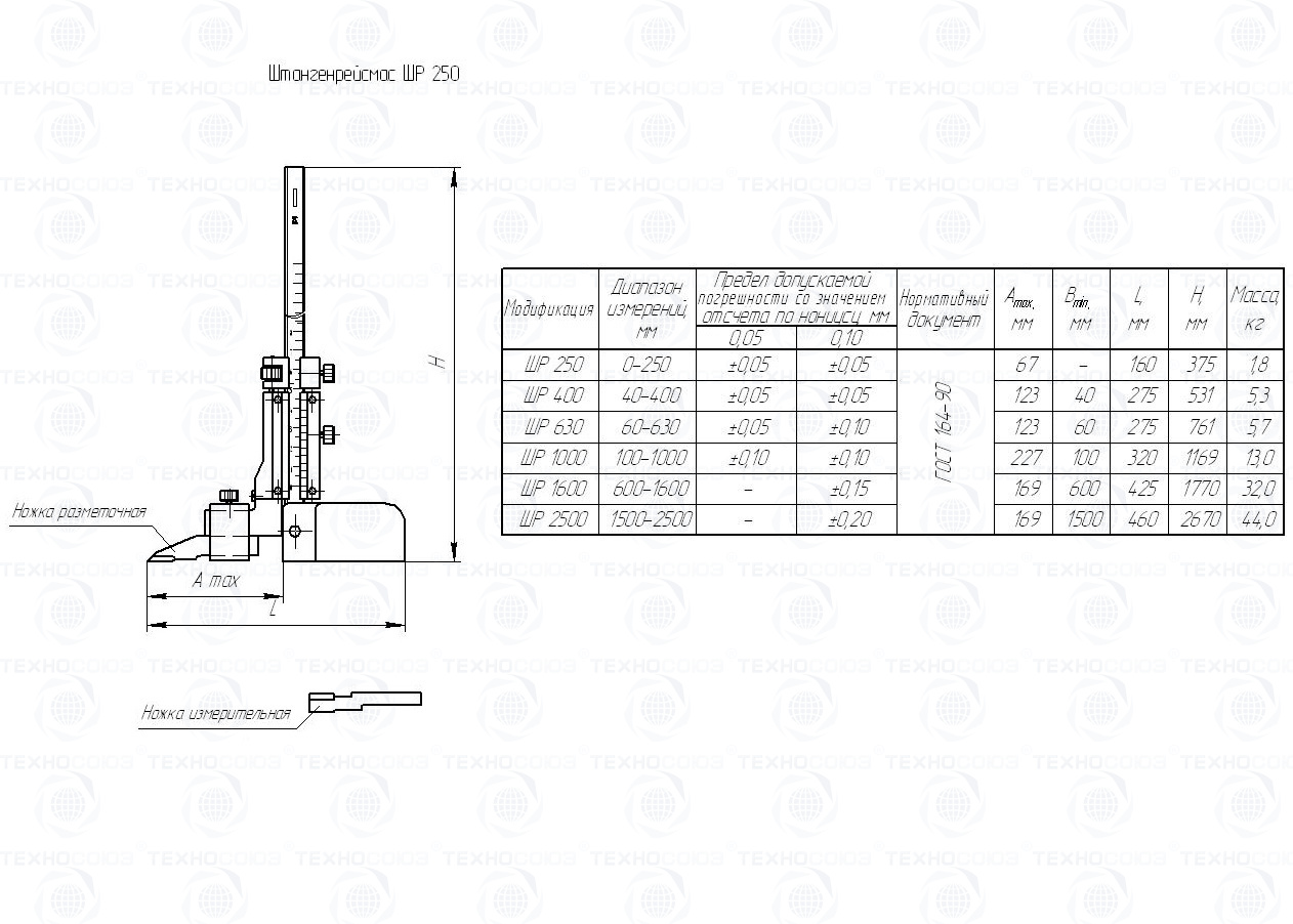 Пример условного обозначения штангенрейсмаса с диапазоном измерения от 0 до 250 мм и значением отсчета по нониусу 0,05 мм - Штангенрейсмас ШР-250-0,05 ГОСТ 164-90.