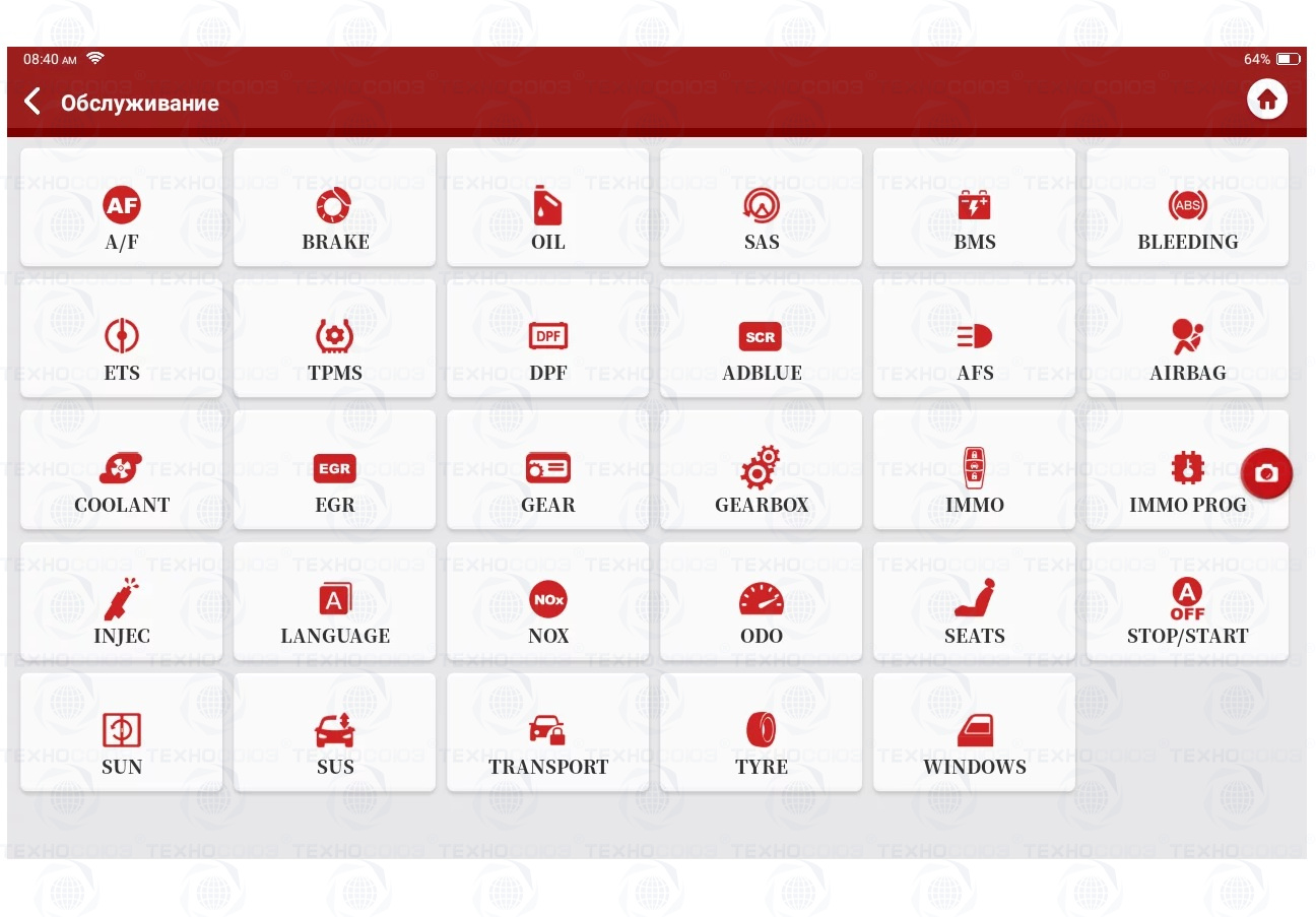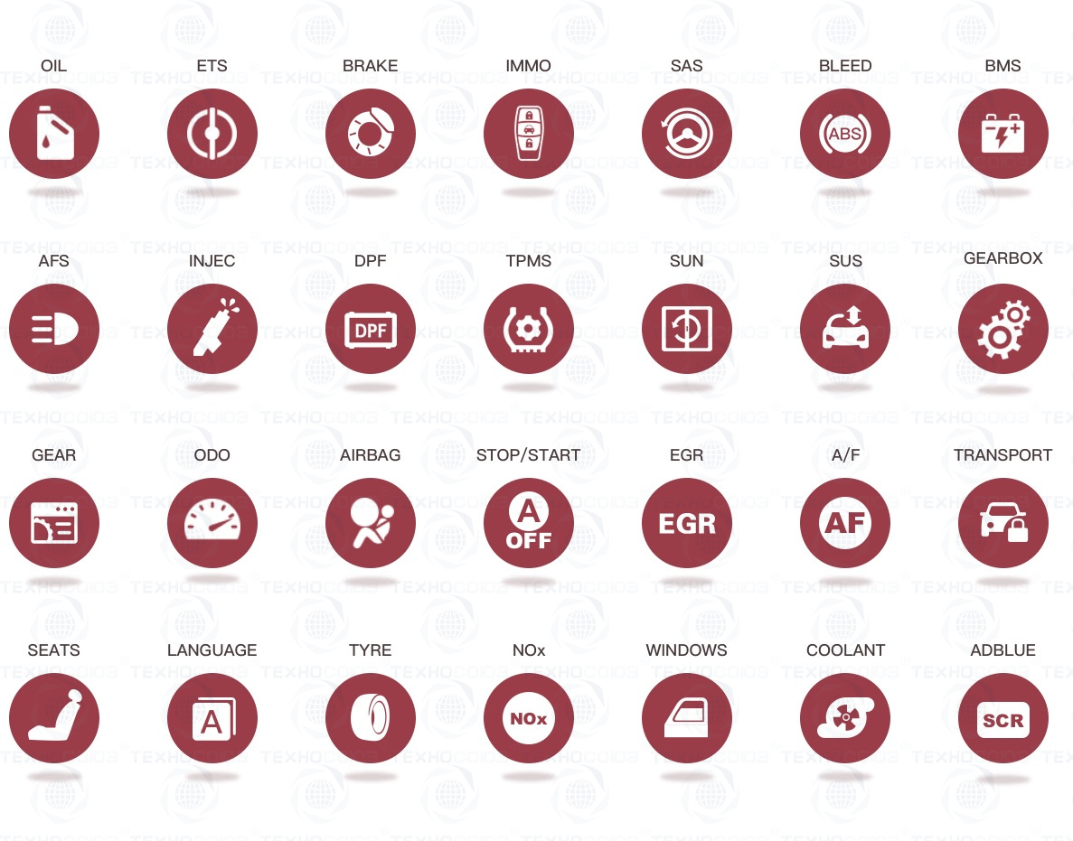 Дополнительные и сервисные программы: VIN decoding, OBDII, RESETOIL, RESETDPF, RESETSAS, RESETBRAKE, RESETBMS, RESETTPMS, RESETSUS, RESETSUN, RESETINJEC, RESETIMMO, RESETETS, RESETEGR, RESETBOX, , RESETBLEED, RESETAFS
