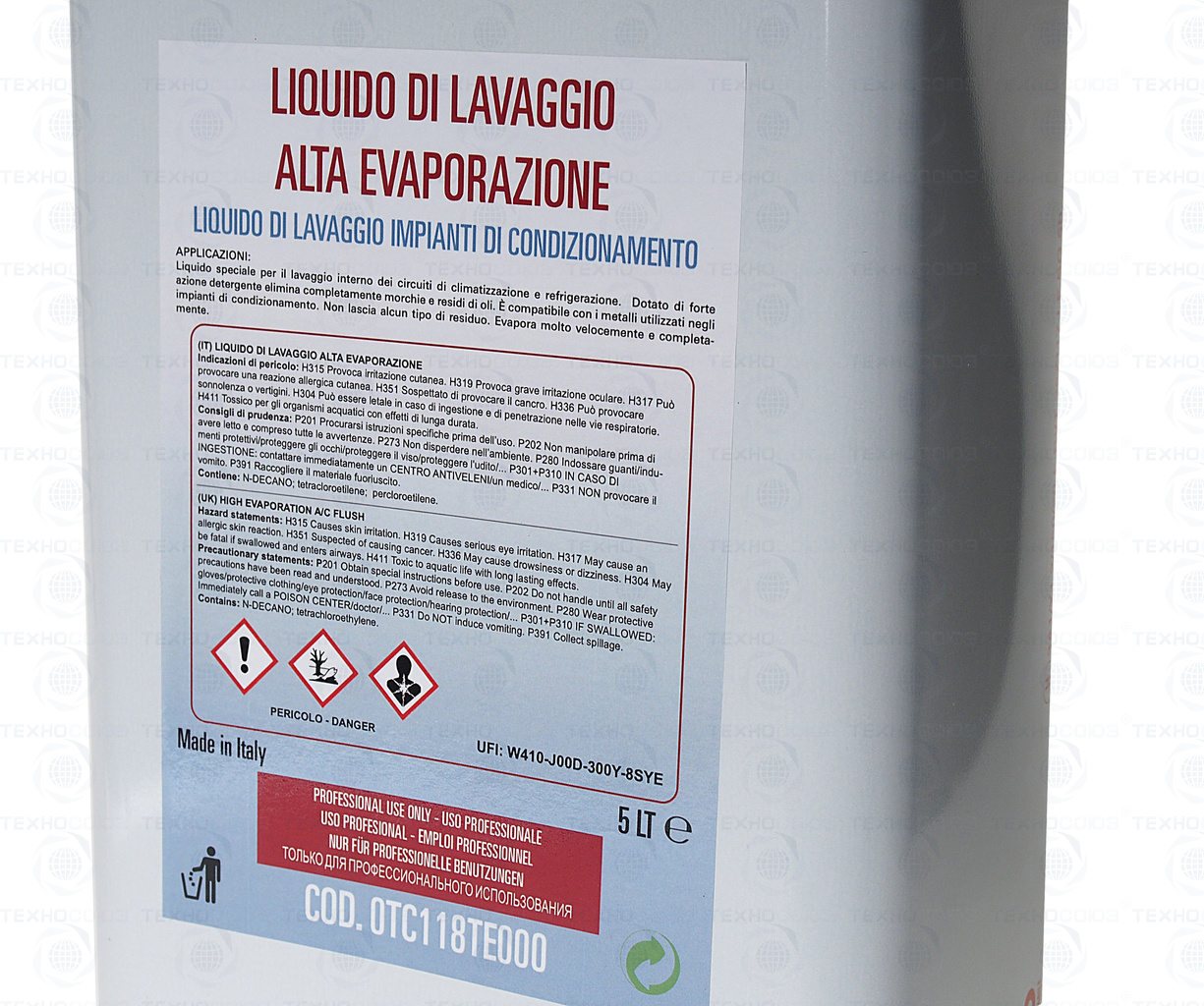 • Промывочная жидкость с высокой скоростью испарения и отличными очищающими свойствами создана для удаления из контура хладагента осадков, загрязнений и остаточных продуктов. Является невоспламеняемым. В связи с этим данная жидкость может применяться с промывочными установками JTC-4631 и JTC-1409, а также с установками оснащенными электронасосом.