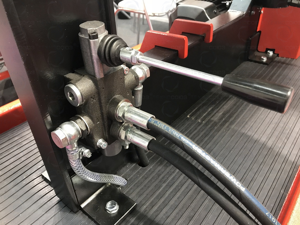 Для хранения набора вспомогательных инструментов в конструкции стенда предусмотрен инструментальный ящик. Управление рабочим гидроцилиндром осуществляется при помощи гидравлического распределителя со встроенным редукционным клапаном и регулятором давления. Гидроцилиндр приводится в действие давлением масла, создаваемым масляным насосом. Масляный насос, размещенный внутри корпуса стенда, является основой гидропривода «Фаворита-П». Вращение насоса осуществляет электродвигатель, соединенный с насосом через муфту.
