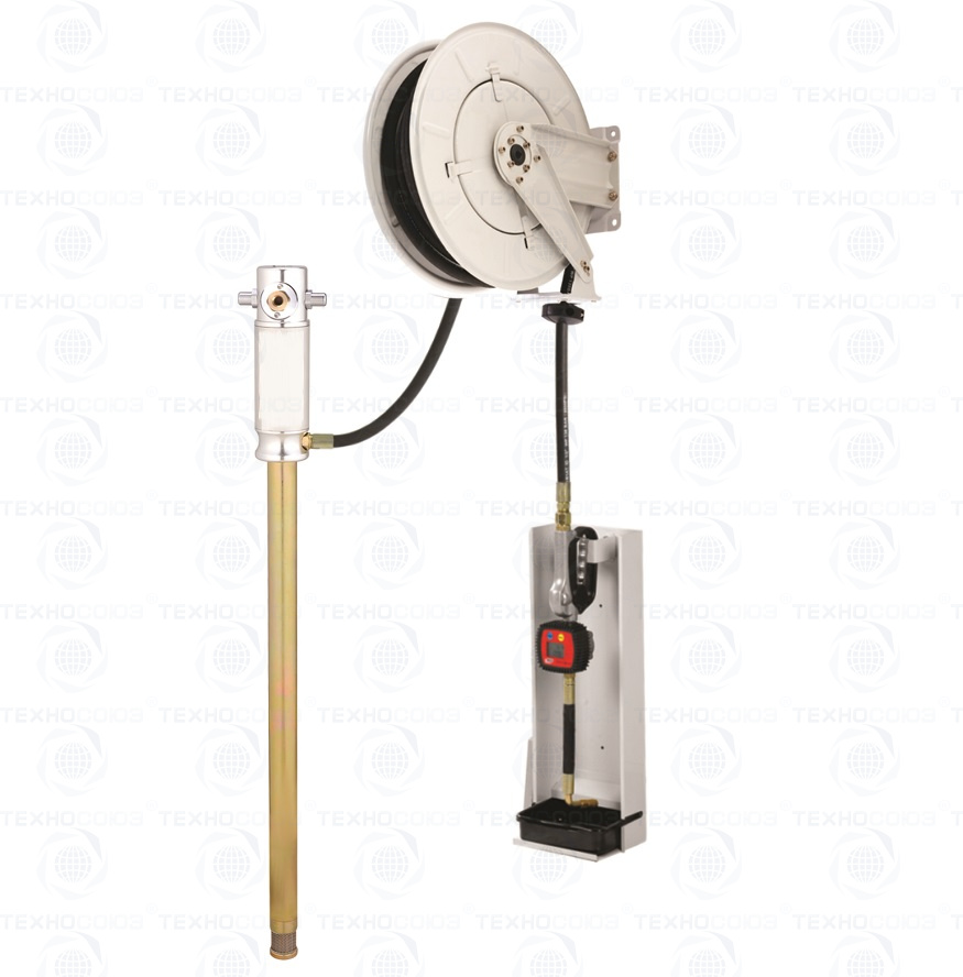 Гарантия 2 года. Настенный комплект для раздачи масла, ATF. Для бочек 180-200л и кубовых емкостей. Комплект: пневмонасос для масла 3:1 производительность 18л/мин h=1250мм + электронный раздаточный пистолет с гибким наконечником и отсечкой (исключает течь масла после остановки насоса) + катушка для масла + шланг маслобензостойкий 10 м. + держатель пистолета с каплеуловителем.