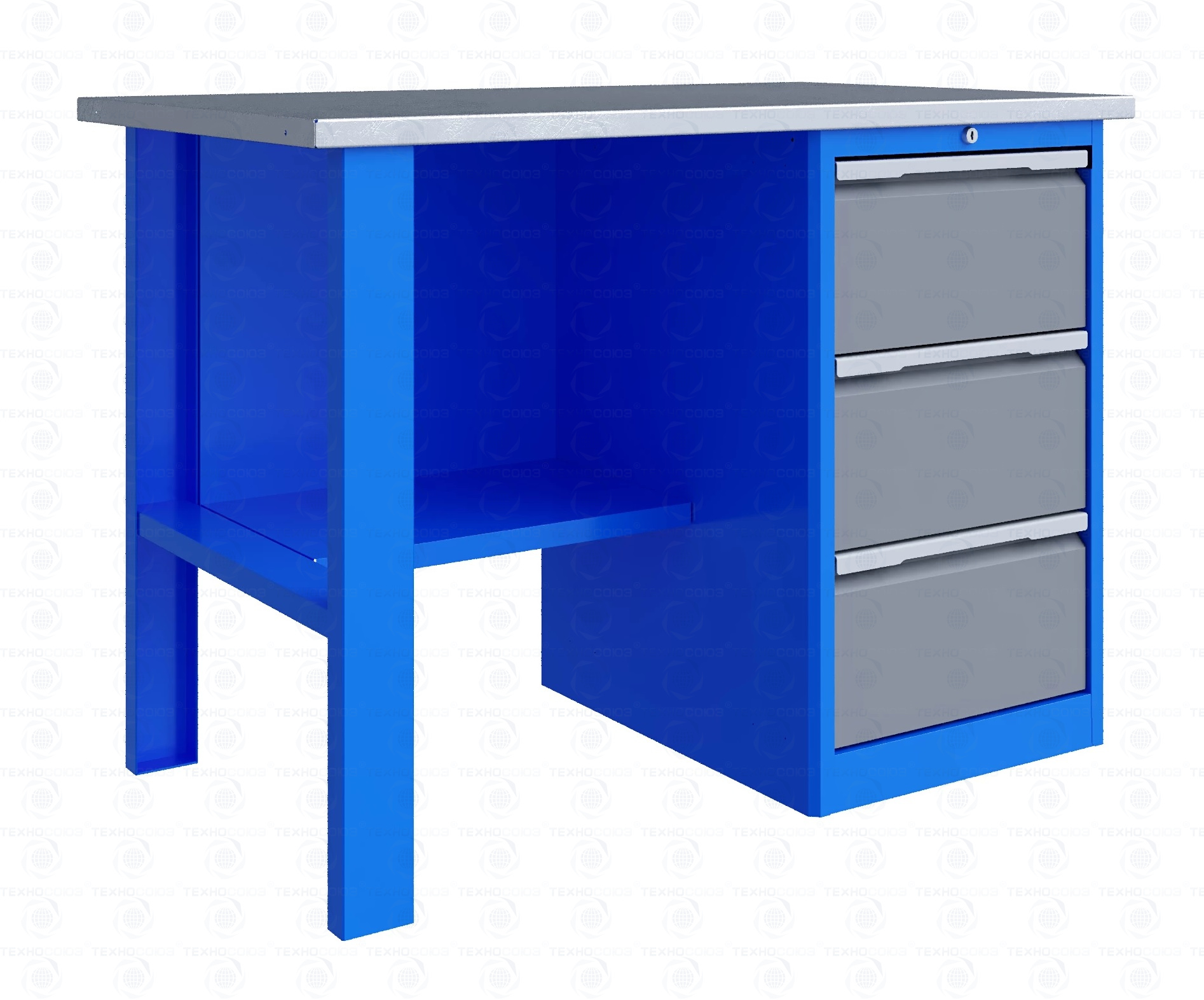 Тумба верстака -сварная. Ящики в тумбе устанавливаются на шариковых телескопических направляющих полного выдвижения. В тумбе P3 установлено три больших ящика. Внутренние размеры больших ящиков (ВхШхГ), не более: 222 х 397 х 520 мм. Тумбы с ящиками снабжены общим центральным замком с поворотом ригеля 180 градусов и подпружиненной тягой. В комплекте два ключа.
