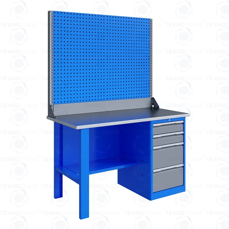 Однотумбовый. Допустимая нагрузка на столешницу 750 кг. Опорные элементы выполнены сварными из холоднокатаной стали. Для выполнения сборочных, ремонтных, слесарных, монтажных и других видов работ на производстве, в сервисных центрах, мастерских, гаражах, а также для обучения технологии в учебных заведениях. Комплектуется полкой-стенкой, расположенной под столешницей для удобного размещения габаритного инструмента и оснастки. Размеры верстака: 855x1396x696 мм. Вес: 78 кг. Поставляется в 4 комплектациях на выбор.
